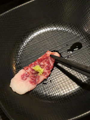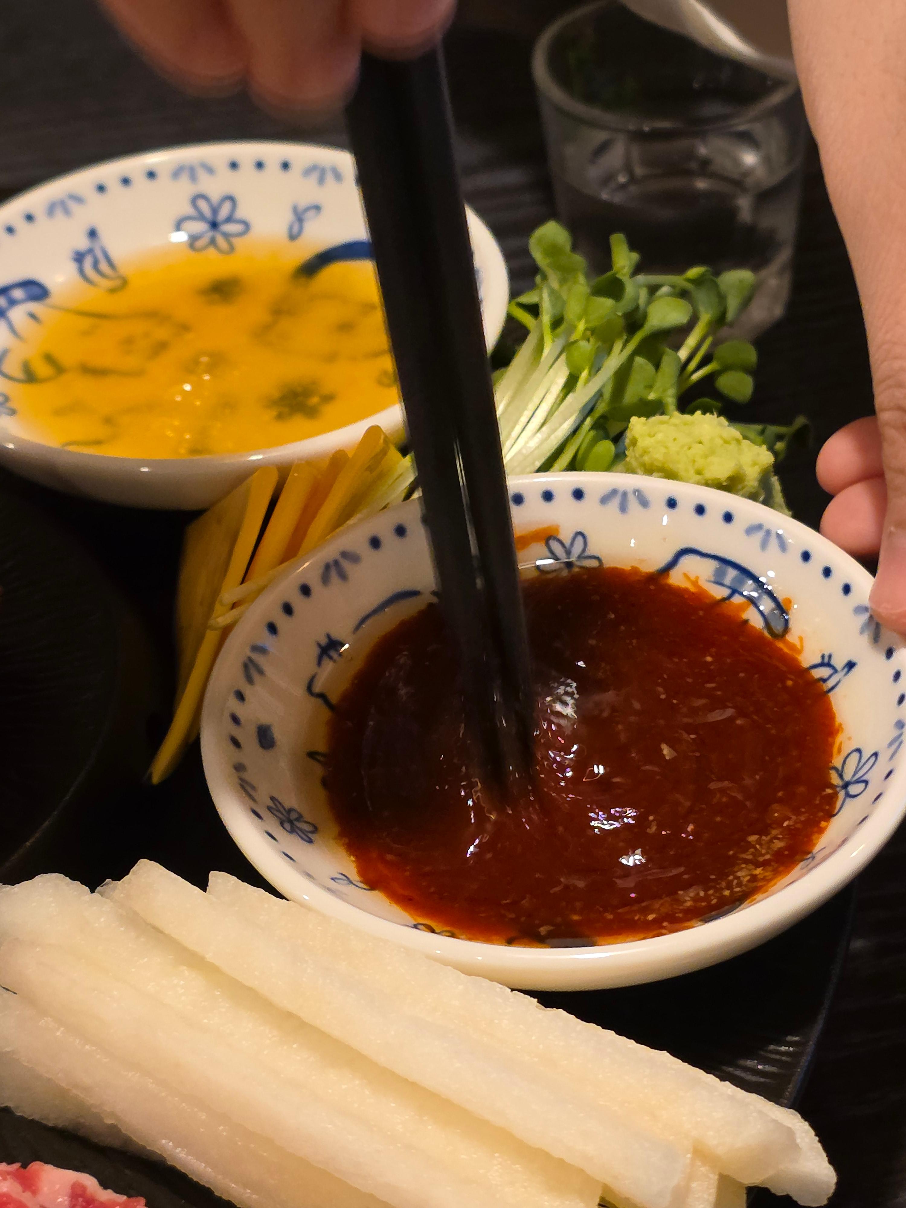 와사비 간장, 기름장(참기름+소금),육회스타일(노른자 섞어서 배 곁들여먹기), 찻잎,무순,쌈무와 곁들여먹기.